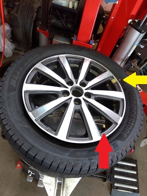 トヨタ86(ZN8)用に新品のスタッドレスタイヤを組み替える作業でホイールのバルブ位置(赤い矢印)にタイヤの軽点(黄色矢印の黄色マーク)を合わせて組込み、空気を入れてバランサーで測定すると、アウター側に50gのアンバランスが出ました。